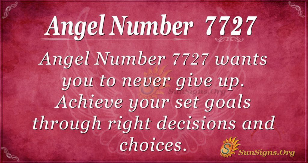 Angel number 7727 is a message that constantly tells you that you should ensure that your decisions and choices get you closer to achieving your set goals. If you want something great to happen in your life, you will not stop until you make the said thing happen. Your guardian angels are telling you that there is no room for giving up.