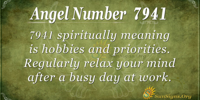7941 is the sign that spirituality means hobbies and priorities. Regularly relax your mind after a busy day at work. It refreshes your mind, making you more productive at work. Hence, identify hobbies you are comfortable with and try them out. You will also interact with different individuals during your free time.