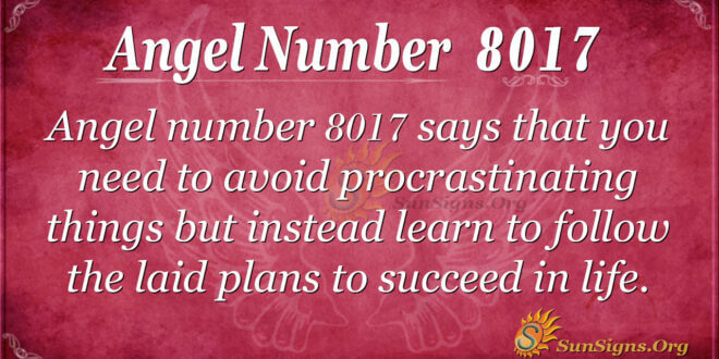What does 8017 mean spiritually? It will help if you become more organized because you will not do any work if you do not know what assignments need to be accomplished. You can invest in a planner or use a calendar. Thus it will make it easier to keep track of your tasks and critical due dates too.