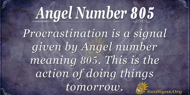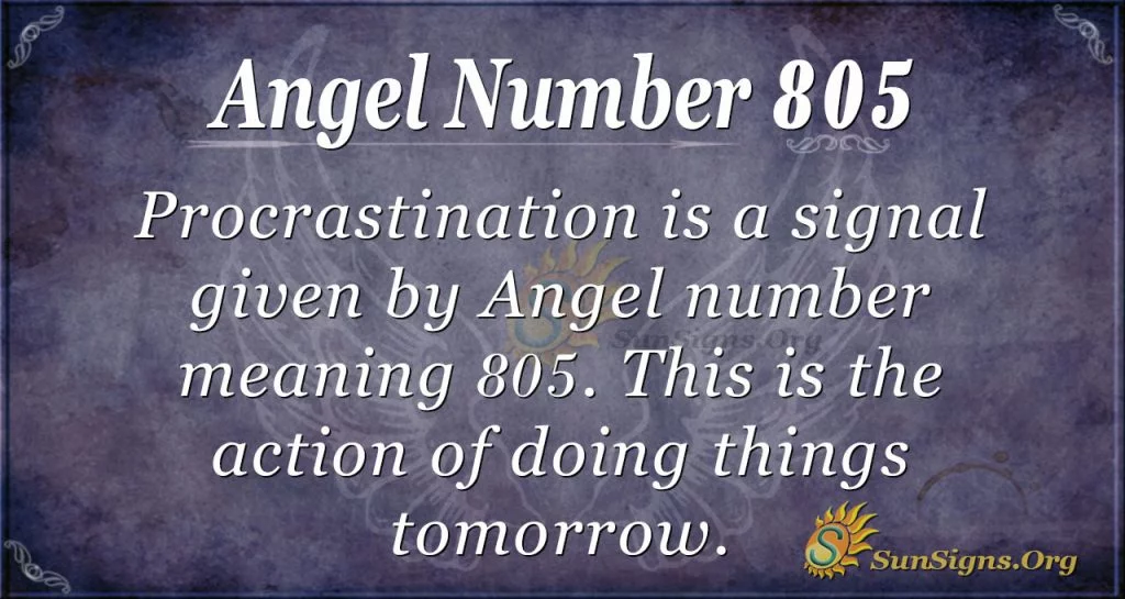 Procrastination is a signal given by a number meaning 805. This is the action of doing things tomorrow. You are a hard-working person. The mojo comes and goes. It is hard for you to work when you are moody. Learn to deal with this issue. Have a daily target.