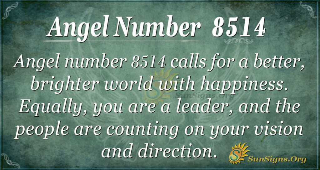 Angel number 8514 twin Flame calls for a better, brighter world with happiness. 8514 in your phone number or house number is an assurance that you are a leader, and the people are counting on your vision and direction.