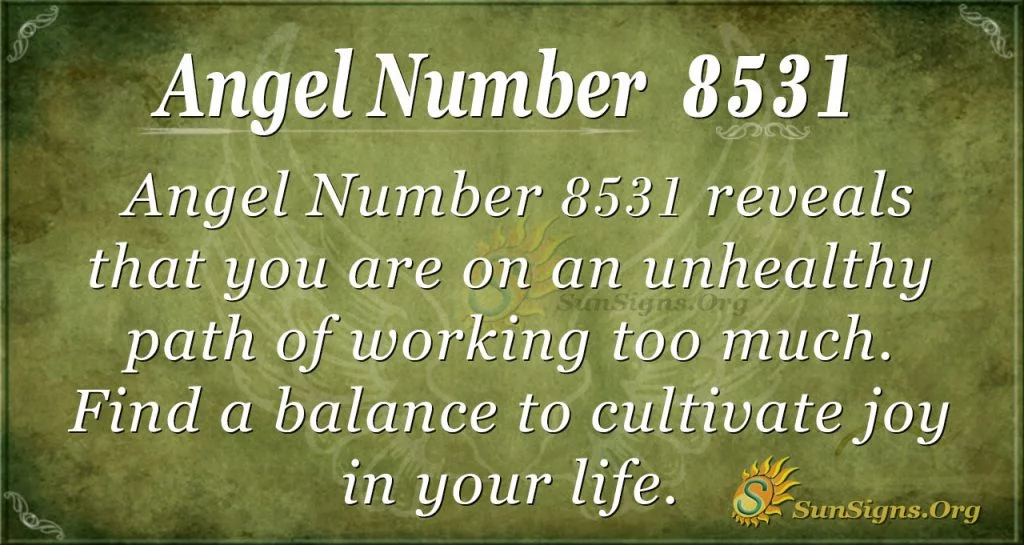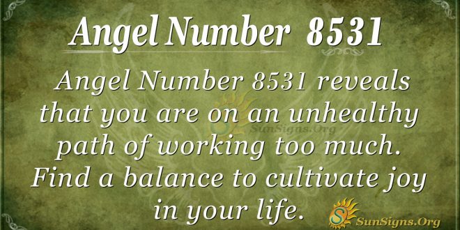 Coming across the number 8531 often signifies that your guardian angels are trying to relay a message to you. Angel Number 8531 reveals that you are on an unhealthy path of working too much. Your dedication to work is very admirable; however, being consumed by the same leads to lacking time for other things in your life. Your guardian angels say that you need to find the balance to cultivate joy in your life.