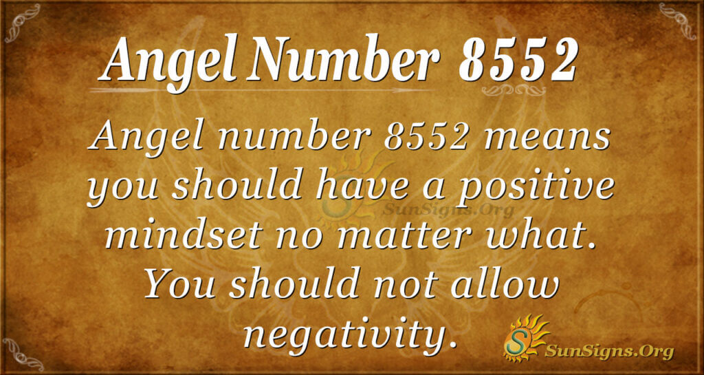 The appearance of angel number 8552 signifies that you should maintain a positive mindset, regardless of the circumstances. You should not allow negativity from jealous people to ruin your good plans. The meaning of phone number 8552 encourages you to disregard negative comments and focus on positive energies.
