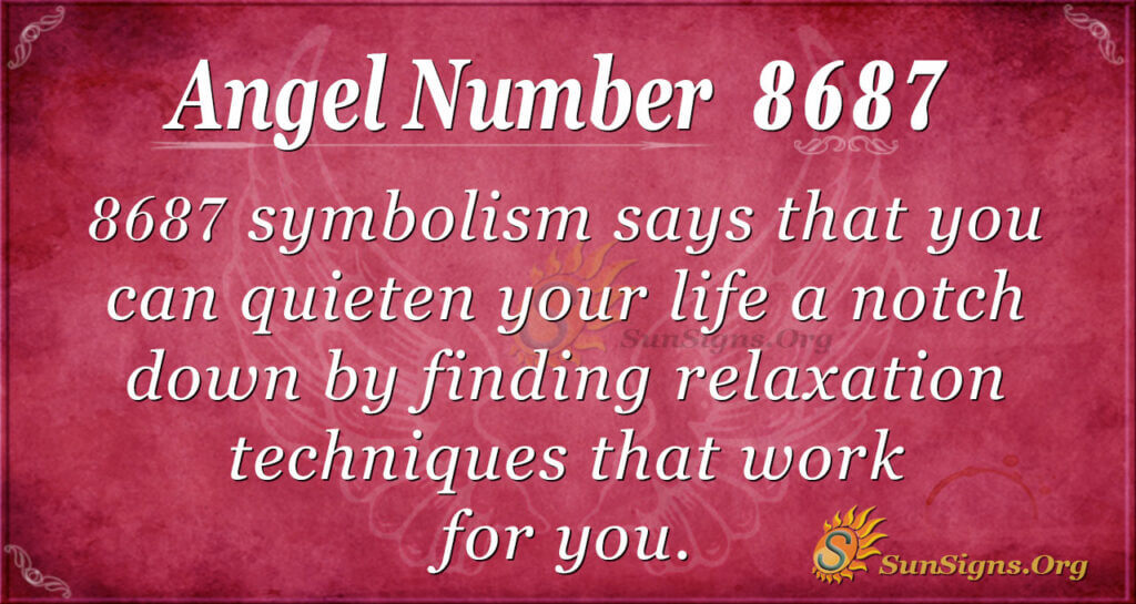 Additionally, 8687 symbolism says you can quieten your life by finding relaxation techniques that work for you. You should turn to relaxation techniques whenever your mind is racing.