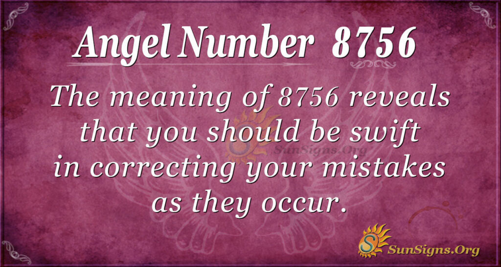 The meaning of 8756 reveals that you should be swift in correcting your mistakes as they occur. Please do not wait too long until it is no longer easy to correct them. You should also not rush to correct something you do not know about. Always seek help where you feel stuck.