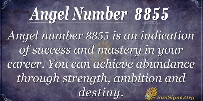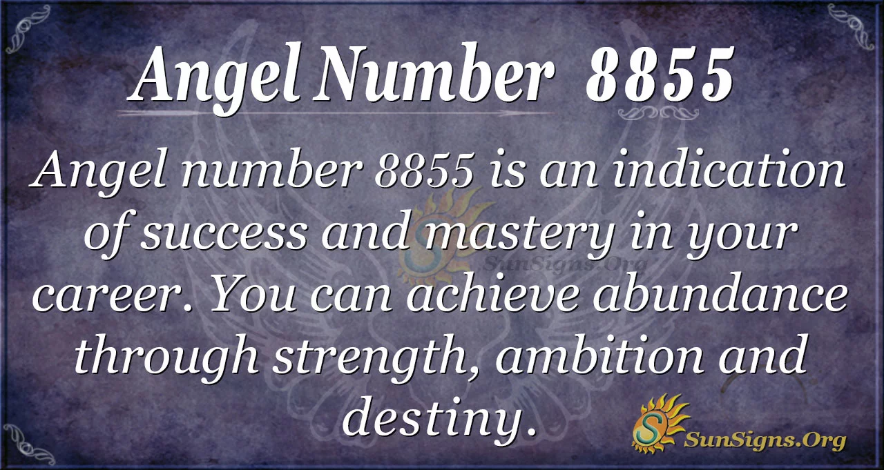 What does number 8855 represent? The number 8855 represents strength, ambition, and destiny. Seeing angel number 8855 is an indication of success and mastery in your career. Take note that it can take the entire five to ten years for you to accomplish your goals. However, when abundance emerges, you will shine brightly.