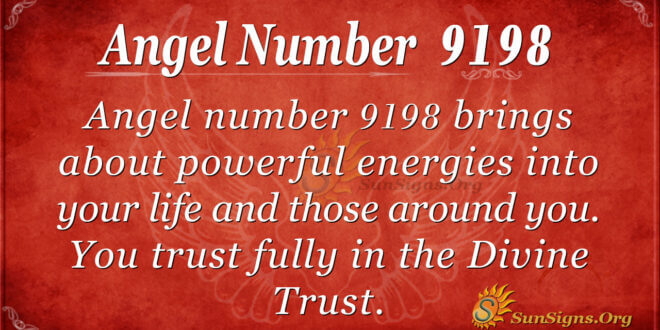 Is 9198 a good number? Twin Flame Angel number 9198 brings powerful energies into your life and those around you. You are reminded to trust more in your abilities and skills. The guardian angels will offer you the needed support and guidance to manifest your visions into reality. This is the right time to use your God-given wisdom, unleashing your true potential to the Universe.