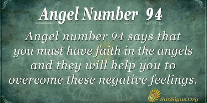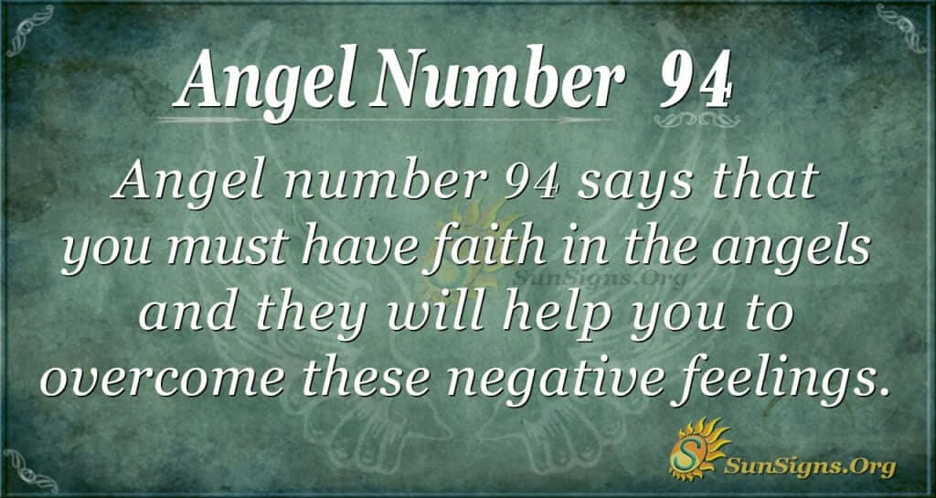 Angel number 94 says that you must have faith in the angels, who will help you overcome these negative feelings. You should have a constructive attitude towards life and look forward to beneficial results with the grace of the angels.
