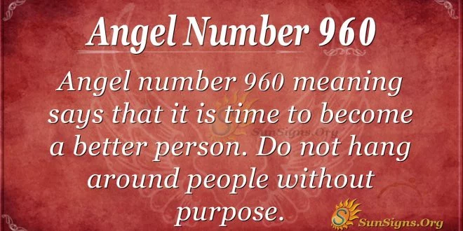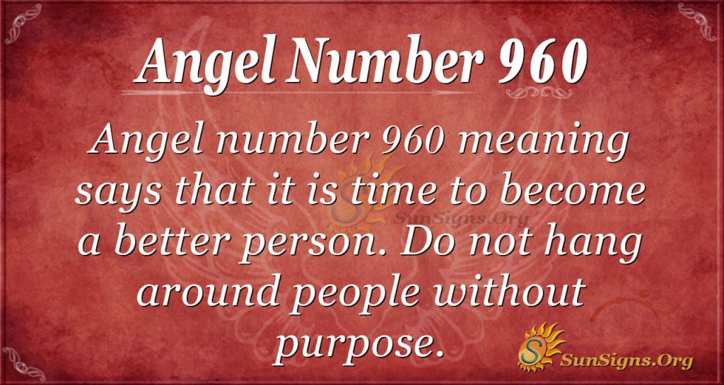 Angel number 960 says it is time to become a better person. Time has passed for you to be hanging around people without purpose. Involve yourself with grown-up men and mature people. Your actions today dictate the success of your future.