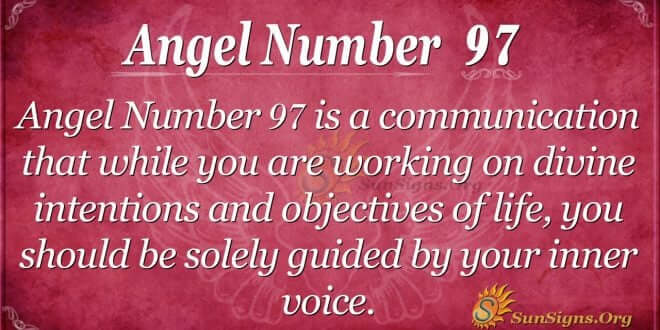 Angel Number 97 is a communication from the guardian angels that while working on divine intentions and objectives of life, you should be solely guided by your inner voice.