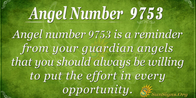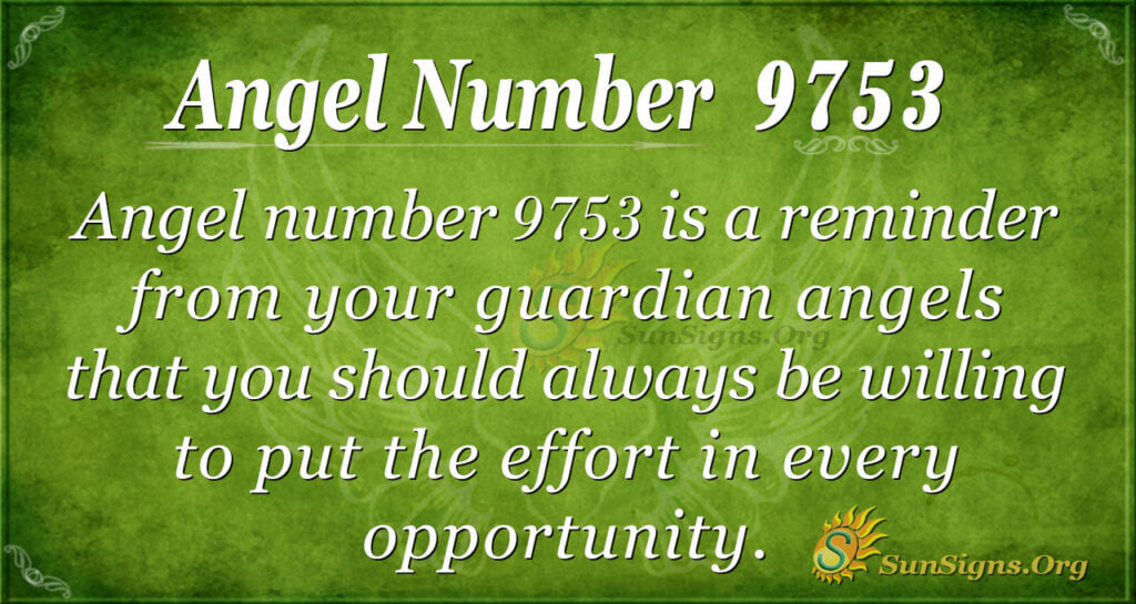Angel number 9753 is a reminder from your guardian angels that you should always be willing to put effort into every opportunity. In other words, you will have many opportunities, so your angels want you to maximize that chance. That can be the door to a successful future. Besides, opportunities come and go, so you should always be ready to open those doors of receiving.