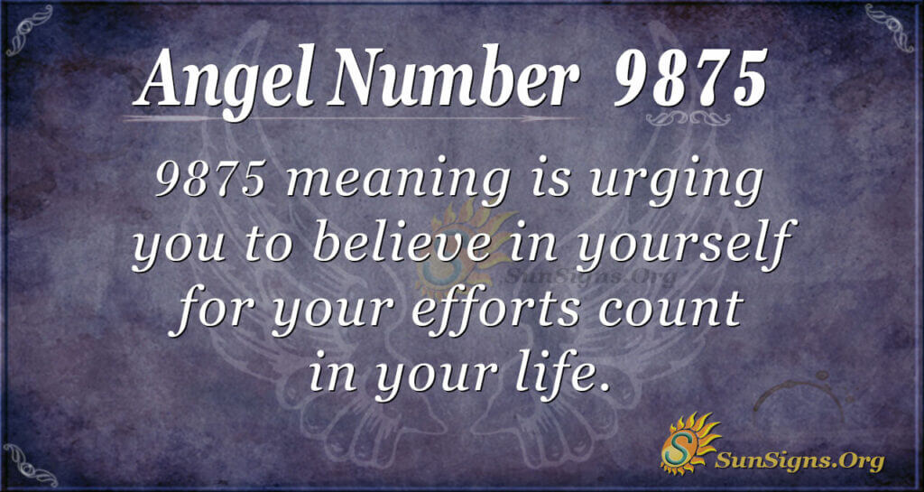 Your guardian angels are telling you that you are a child of a King. You will climb mountains and swim across oceans in your life. You only need to stay focused and live your life one day at a time. Spiritually, 9875 is telling you to stretch your hand to get help from the divine realm.