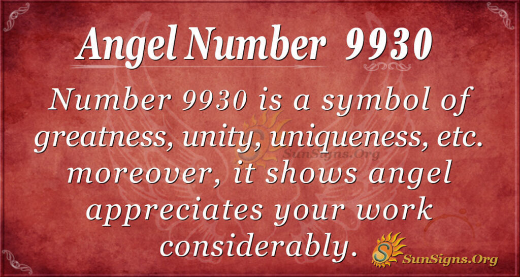 Number 9930 is a symbol of greatness, unity, uniqueness, etc. Moreover, it shows angel appreciates your work considerably. Angel appears to you to encourage you that time heals everything. Therefore, give time, sometimes everything will be according to your plan. Also, work hard and change your mentality on the perception of life.