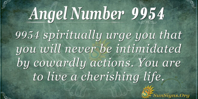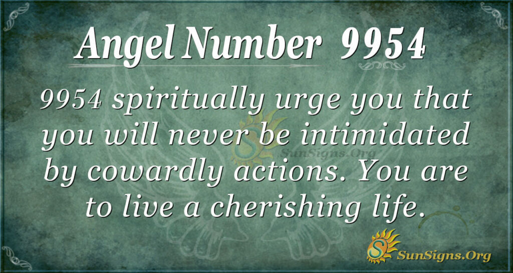 9954 spiritually urges you that you will never be intimidated by cowardly actions. You are to live a cherishing life. The angels are inspiring you that no one will hijack what is for you. Therefore, keep trusting in God. Your blessings are yours