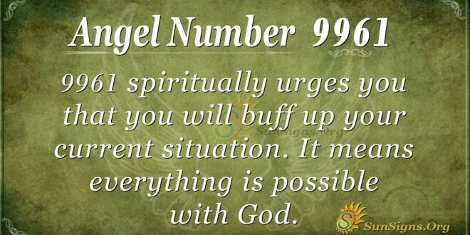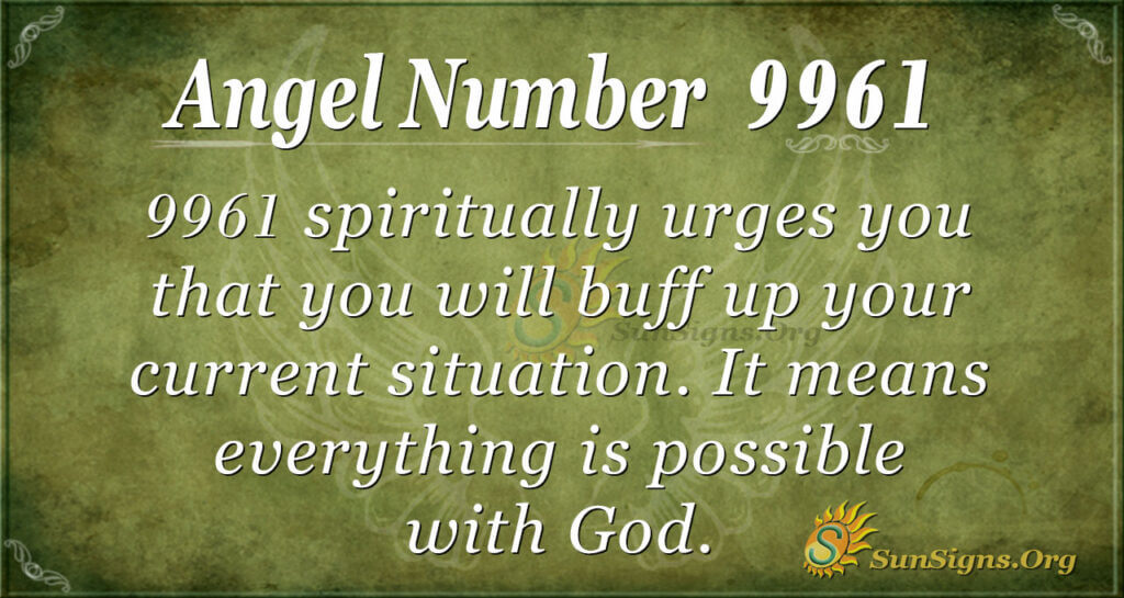 9961 spiritually urges you that you will buff up your current situation. It means everything is possible with God. It is, therefore, necessary you show humanity to the world, for you will always win. The angels promise you that they have the key to your wealth.