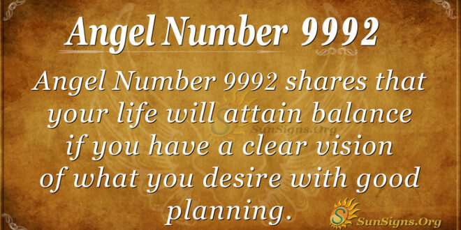 The next time angel number 9992 appears to you, it will be easy to understand what it means. Some facts about 9992 are clear: your life will attain balance if you have a clear vision of what you desire.
