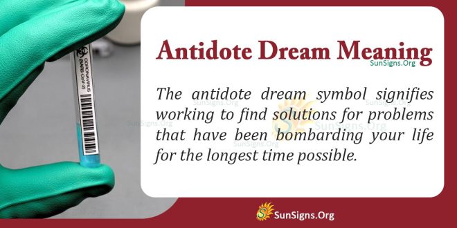 According to the antidote dream dictionary, taking an antidote for a snake bite in your dreams means that you will find the courage and strength to face your fears. You will do everything required of you to achieve lasting peace of mind.