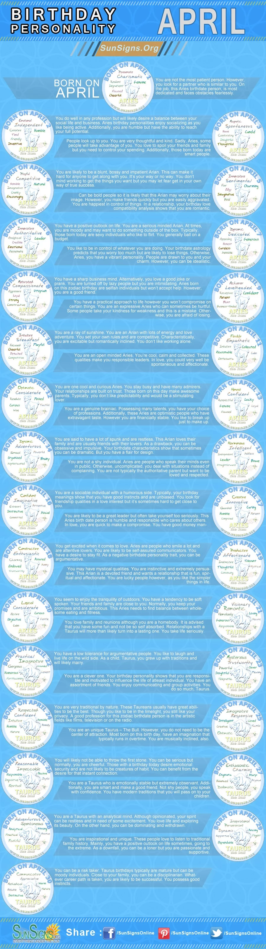 Let the April birthday Infographics presented by Sunsigns.Org give you an exclusive insight into your birthday personality. So how are similar or different people born on different days? Or maybe born in the same month? You will be surprised to know that each birthdate has its unique personality traits.