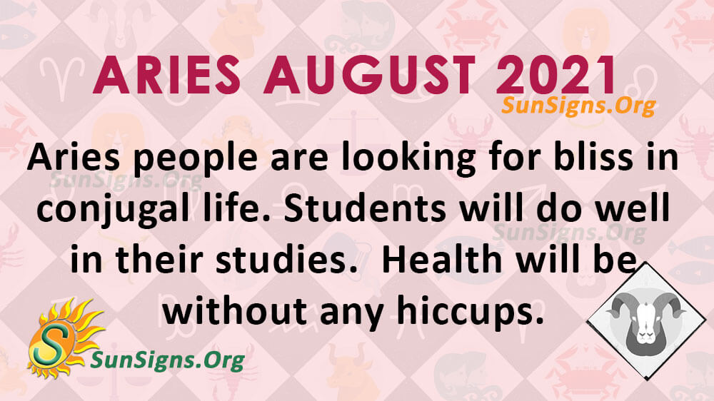 monthly 2021 horoscope for Aries zodiac sign forecasts wonderful health prospects during the month of August. Stellar positions are encouraging and this will prevent any major health disorders. Small ailments can be cured with immediate medical care.