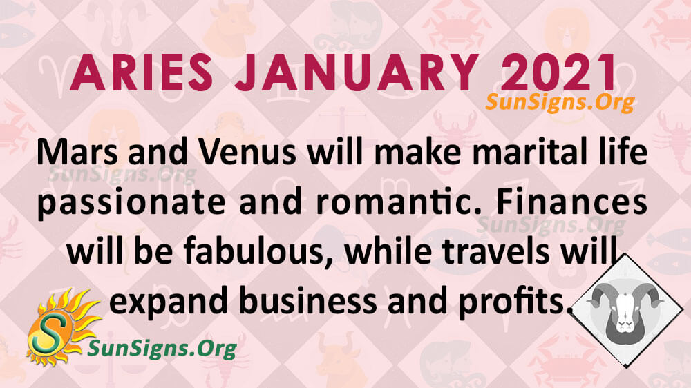Predictions for January 2021 Aries Horoscope suggest that the presence of Jupiter from the 22nd will bring affluence. Professional matters will be in the center stage this month. Aries personality will have no problem in facing the various difficulties that you may encounter.