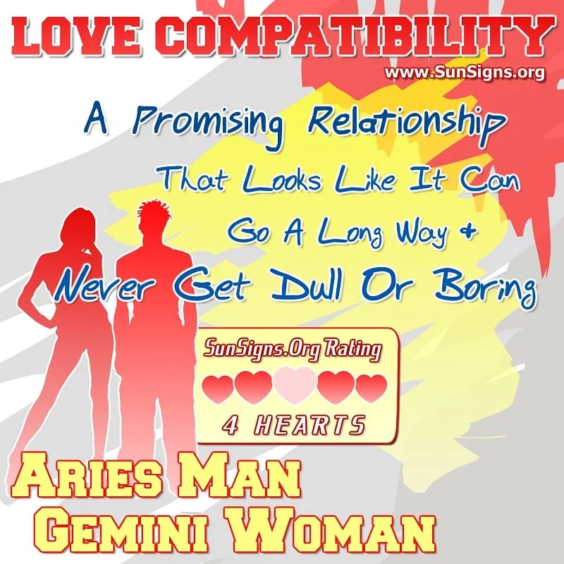 Aries is a cardinal fire sign and Gemini is an air sign that is mutable by nature. The Aries man Gemini woman compatibility gets a FOUR Hearts love rating. To keep the relationship going will require growth from both the Aries man and Gemini woman.