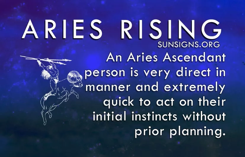An Aries Rising person is very direct in manner and extremely quick to act on their initial instincts. They do so without prior planning or first considering the consequences and outcomes. If Aries decides they want something, they will not hesitate to go and get it. Though their actions are often sudden and rash, their intentions are seldom anything but good.