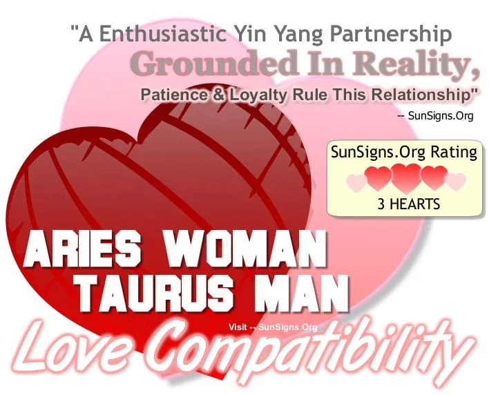 Aries is a cardinal fire sign, and the Taurus is a fixed earth sign. The compatibility between Aries woman and Taurus man gets a THREE Hearts rating. Both parties are committed to the relationship, as an Aries woman and Taurus man in love will be. He will leave her alone well before an argument, and she grows heated. The Aries woman Taurus man make an intense match.
