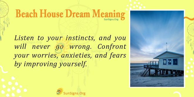 Based on the beach house dream analysis, this dream means that you should purify your energies. It is also a sign that you must believe in yourself and keep working hard to make your dreams a reality. Listen to your instincts, and you will never go wrong. Improve yourself to confront your worries, anxieties, and fears.