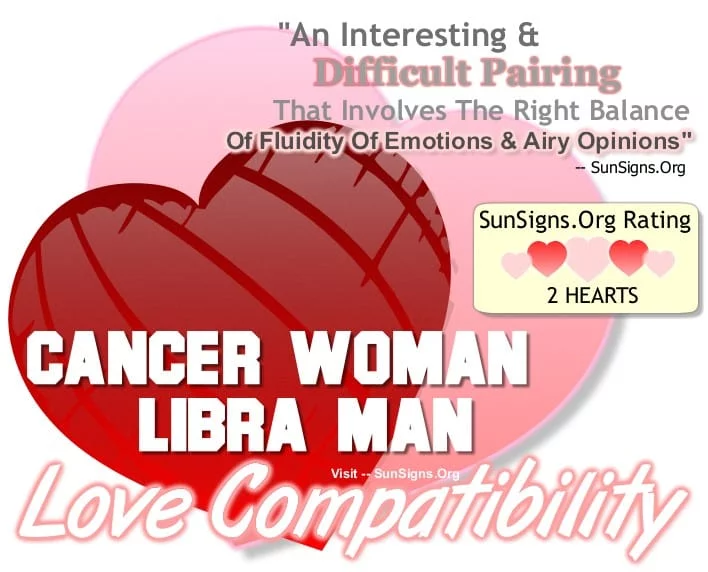 Cancer is a cardinal water sign whereas Libra is a cardinal air sign, the Cancer Libra compatibility gets a TWO Hearts rating. It will take a lot of communication and compromise for the Cancer woman and Libra man to overcome their fundamental differences. But if she can give him space he needs to figure things out for himself, and he offers her the security she wants, their love life together will go far. Compromise and communication are essential for this love match.