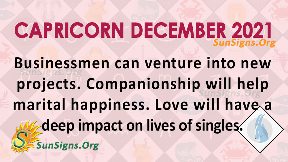 Predictions for December 2021 Capricorn Horoscope indicate a propitious time for starting new projects. Love life can be made more harmonious by making a few adjustments. Life will be exciting with too many activities during the month. It is important for Capricorn personality to take a few breaks to replenish energies.