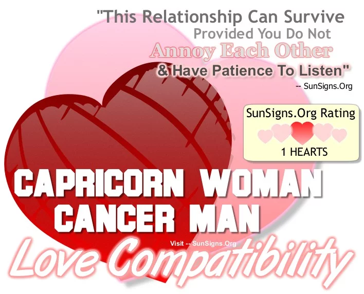 Capricorn is a cardinal earth sign whereas Cancer is a cardinal water sign, the Capricorn woman Cancer man compatibility gets a ONE Hearts rating. The Capricorn woman Cancer man love compatibility will succeed only if both partners have the patience to listen to each other.
