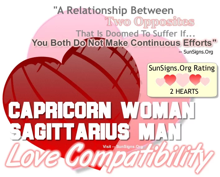 Capricorn is a cardinal earth sign whereas Sagittarius is a mutable fire sign. The Capricorn woman Sagittarius man compatibility gets a TWO Hearts rating. The Capricorn and Sagittarius pair will have to put as much effort into their relationship as they do in their pursuits.