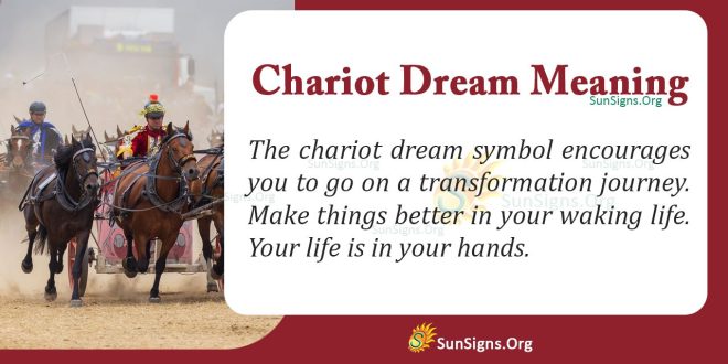 The chariot dream symbol encourages you to go on a transformation journey and make things better in your waking life. Your life is in your hands. Do what is good for you.