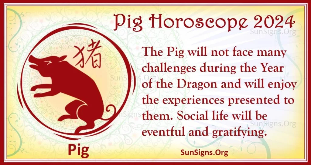 The Pig will not face many challenges during the Year of the Dragon and will enjoy the experiences presented to him. On the career front, he will succeed with his skills and past understanding. There will be encouragement from his superiors, and he will excel in his profession.