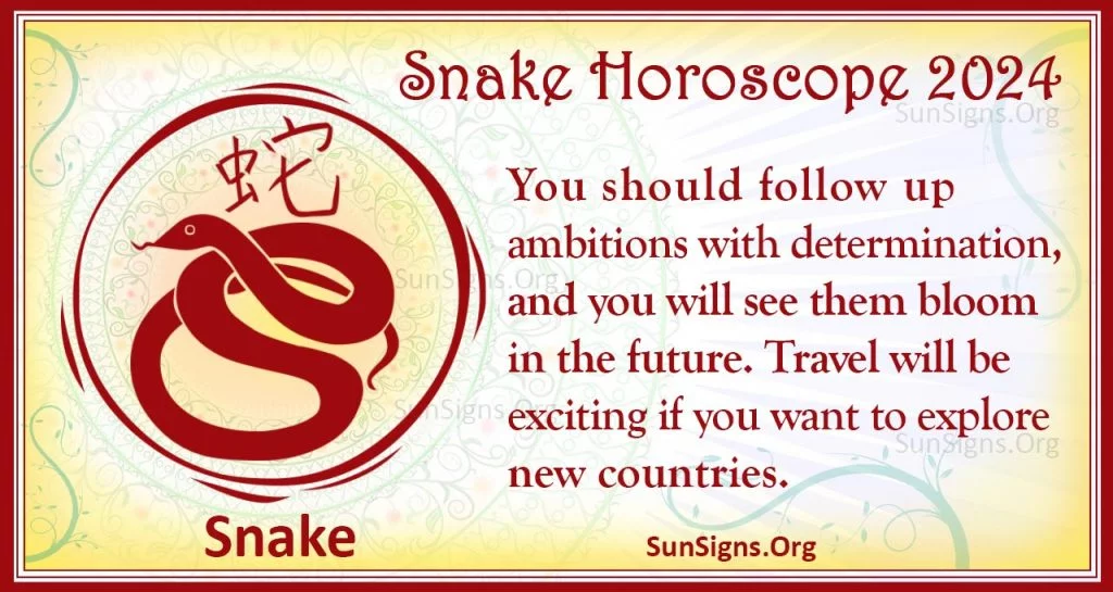 Chinese Horoscope for 2024 for the Snake indicates a tough year for career professionals and business people. However, the year is promising for starting new projects which will become profitable in the future. You should follow up ambitions with determination, and you will see them bloom in the future. The last quarter of the year will be beneficial for visualizing and executing new strategies.