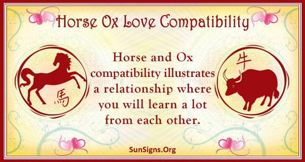 Horses will usually be extroverted and impetuous. They will fully appreciate their partner. They enjoy adventure, while the Ox is calmer, detail-oriented, and respectable to share those traits with their lover. However, they inevitably find the Ox too strict or severe and want them to lighten up.