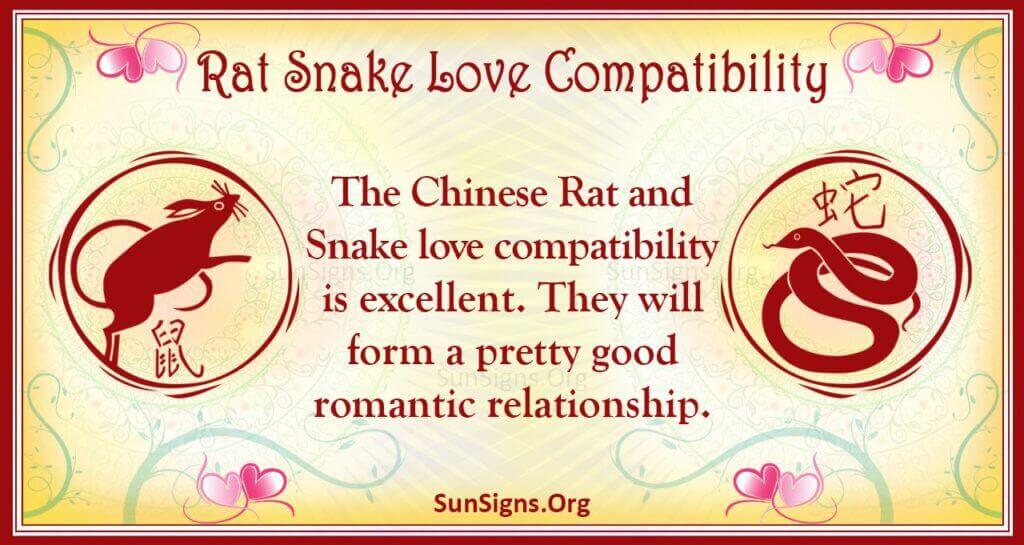 The Rat and the Snake both like objective things and will not stop working to achieve their goals. Both the Rat and the Snake will enjoy a relationship full of success and achievements. These two animal signs will both have to have the right attitude and have comparable goals.