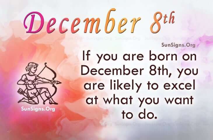 Famous people born on DECEMBER 8th are Sagittarius who confuse their friends. One day they are aggressive; then the next, they are shy. Additionally, they are likely to fall in love at the drop of a hat. Still, they have problems with being faithful.
