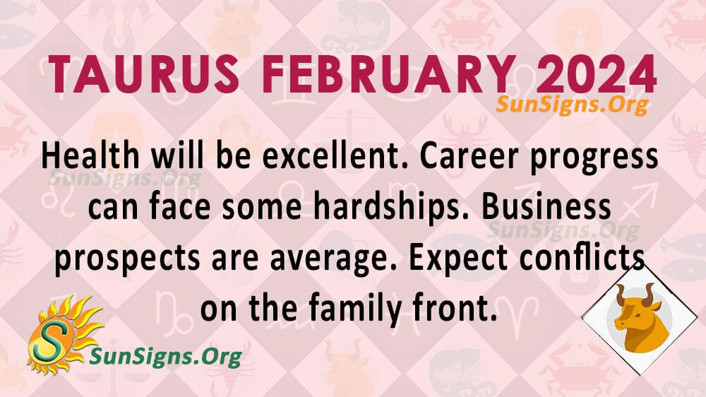 Career prospects for the Bulls are average in February 2024. Relationships with colleagues are not pleasant. Do not expect any rewards. Business ventures fail to give the expected returns. All new investments should be postponed. The family environment is not congenial and there might be conflicts with family members.