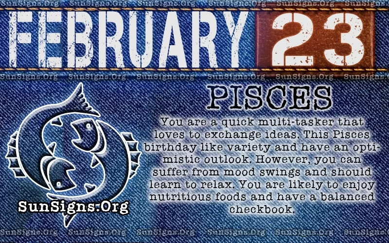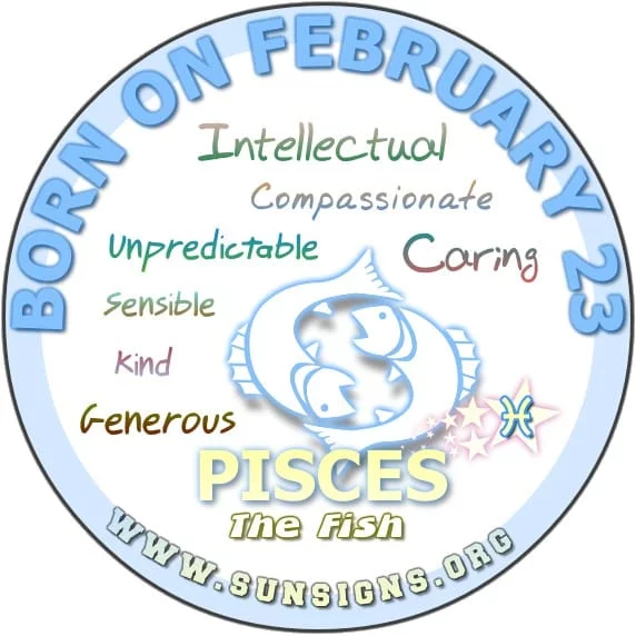 IF YOU ARE A FEBRUARY 23 BIRTHDAY PERSON, you are compassionate, caring, and rational people. The Pisces birthday horoscope for February 23 shows you are sensible, quick-witted, and intellectual. What more could you ask for in a friend or business associate? You are everyone’s best friend.