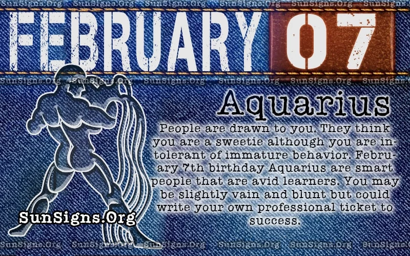 Aquarians born on February 7 have a flair for the unusual. Your distinctive style expresses who you are on the inside. You do so that others want to be like you. You are a charmer with a great sense of humor. All of these qualities make you popular amongst your peers.