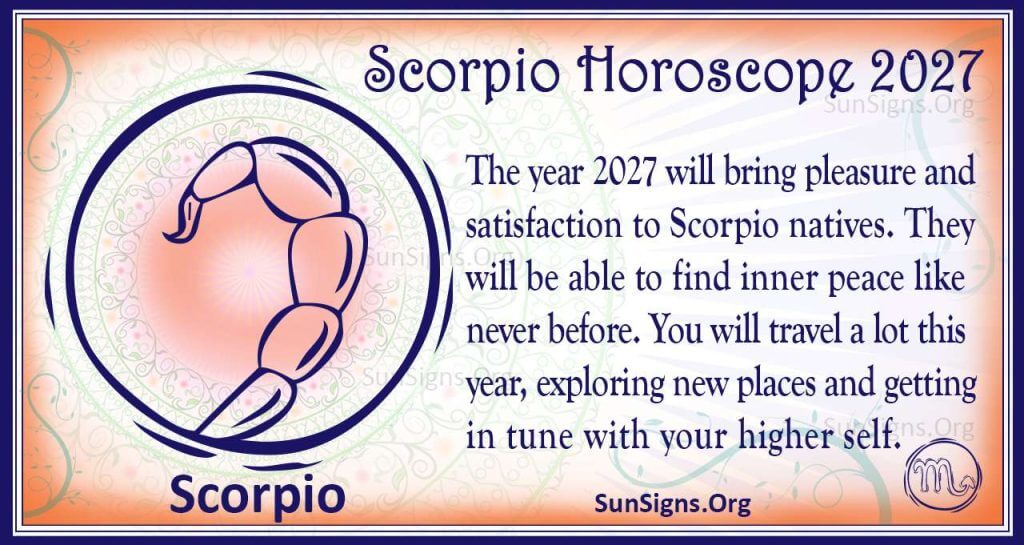 The year 2027 will bring pleasure and satisfaction to Scorpio natives. They will be able to find inner peace like never before. You will travel a lot this year, exploring new places and getting in tune with your higher self.