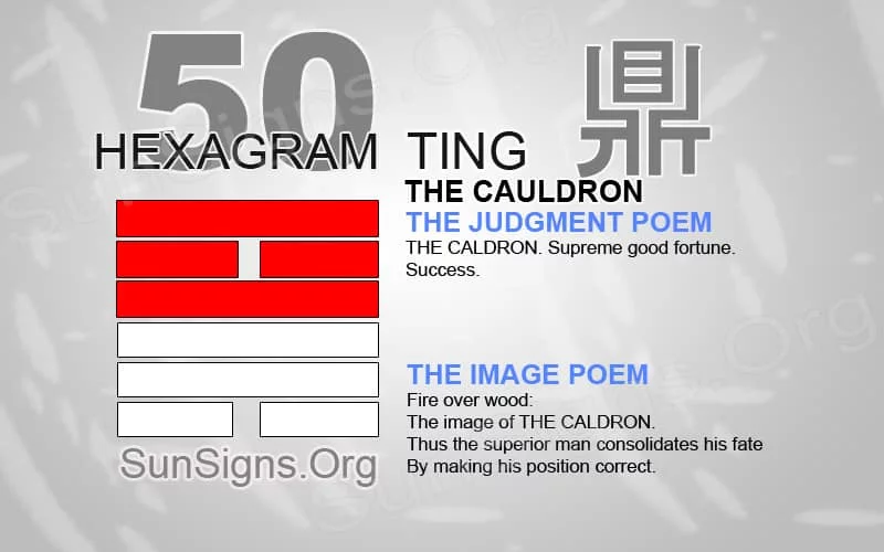 Hexagram 50 represents the need to find harmony and nourish those things that bring balance into the world. This hexagram goes further than Ching, which is the nourishment of the self. Go beyond yourself to help nourish those around you.