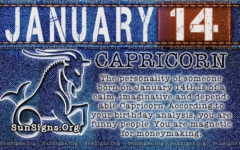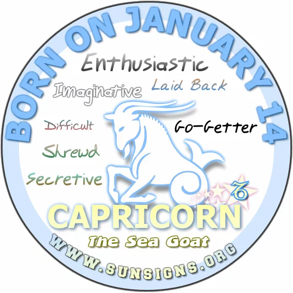 January 14 birthday horoscope predicts that you are what defines the personality of a real Go-Getter! Capricorns with a January 14th birthday are the happiest people, especially when juggling careers, education, social and health issues. You are one multi-tasking person. You like to be busy all the time.