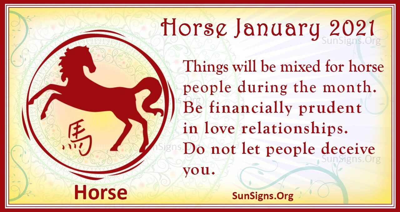 Horse Chinese astrology for the month Of January 2021 presents mixed fortunes for Horse individuals. Profession, finances, and health prospects are fabulous. Relationships and pregnancies can be a source of worry. They may be ditched by close friends or love mates. This will make them highly cynical about friendships and intimate alliances. They should take their own time to get over these things. Instead, they should try to focus on improving their financial position. This will come in handy in the future.
