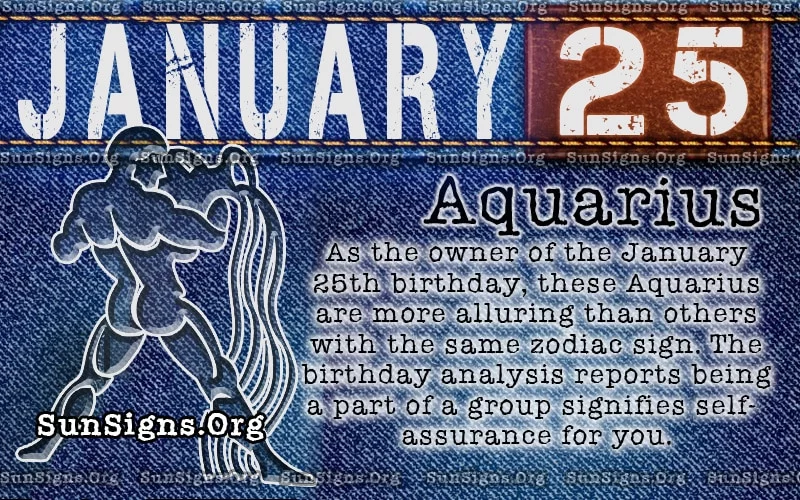 JANUARY 25 birthday horoscope predicts that you personify the word originality. With every chance you get, you take on new experiences, whether traveling or a new job opportunity. It makes your day when you can provide valuable input to people. So, what zodiac sign is January 25? Yes, of course, you have an Aquarius birthday! And you are very innovative.