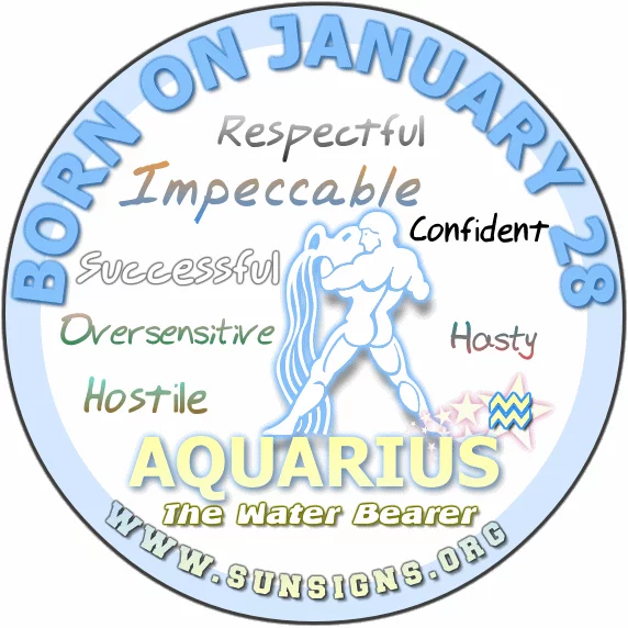 Those of you who have a birthday of January 28 tend to become loners as you get older. It would seem that retirement takes on a whole new meaning. You may use this time to meditate or get in touch with the spiritual you. Without interference from others, you can accomplish the reinvention that is necessary to complete the next phase of your life. In short, Aquarius, you are friendly and honest and you make a great spouse.