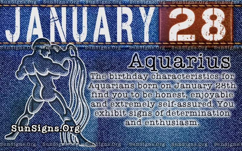 Aquarians realize that the world is forever changing, and you feel so should the rules. As far as improvements go, almost anything can be enhanced. You are extremely confident in your quests. The enthusiasm with which you take on projects should be admired. This January 28 birthday horoscope predicts that you are a stable-minded individual who is outgoing and independent.