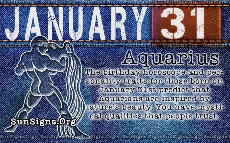 JANUARY 31 birthday horoscope predicts that your eyes appear mysterious and uncommon to anyone else. They say the eyes are mirrors to our soul and if this is true, you certainly fit the description. The January 31 horoscope shows that your zodiac sign is Aquarius. You are always on the lookout for something new. You get bored too easily.