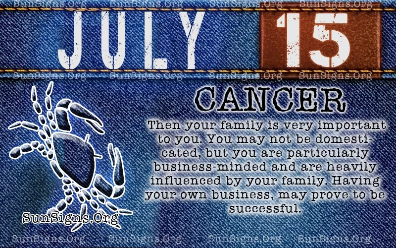 The July 15th zodiac predicts that you are prone to have strong family connections and will more than likely work to achieve a comfortable lifestyle for you and your family. You spend a lot of time and money on making your dwelling place comfortable.